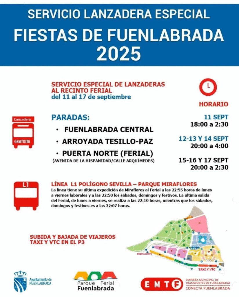Con motivo de las Fiestas Patronales de Fuenlabrada 2025, que se celebran del 11 al 17 de septiembre, el Ayuntamiento ha puesto en marcha un plan especial de movilidad para facilitar los accesos al nuevo Parque Ferial.
