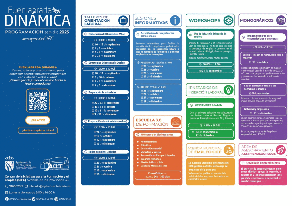 El Ayuntamiento de Fuenlabrada, a través del CIFE (Centro de Iniciativas para la Formación y el Empleo), ha lanzado la nueva programación del programa ‘Fuenlabrada Dinámica’ para el último trimestre del año. Una iniciativa que ofrece cursos gratuitos, talleres especializados y actividades de apoyo al empleo y emprendimiento dirigidas a personas desempleadas, profesionales y empresas del municipio.