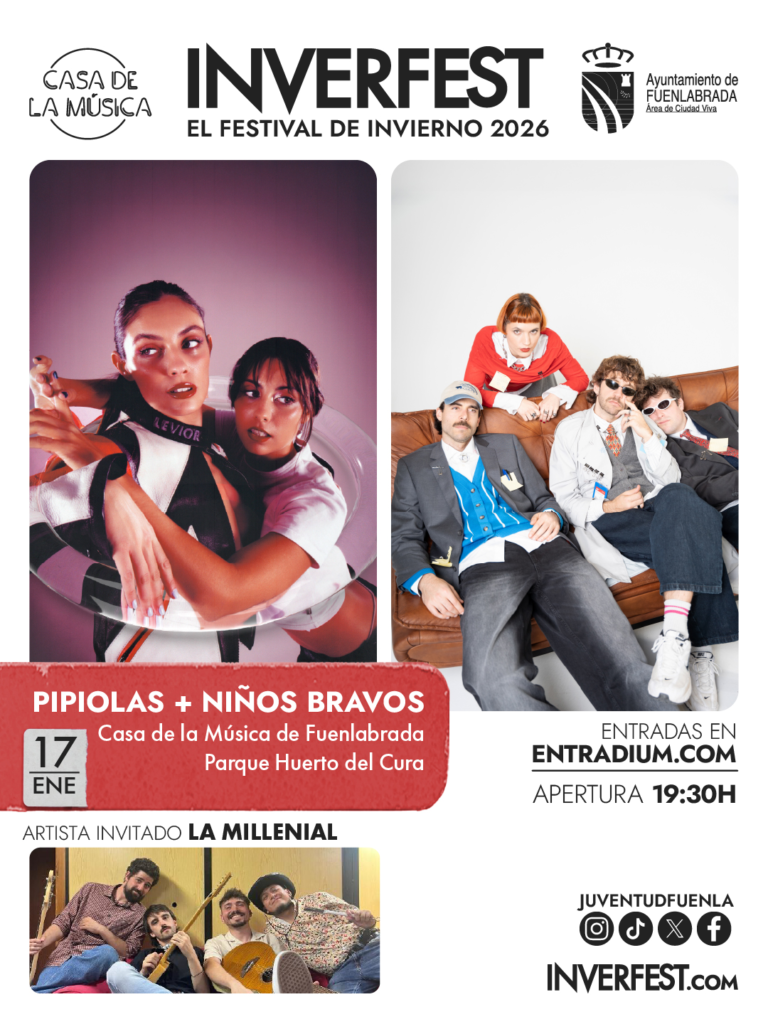 Sábado 17 de enero: Pop y nostalgia dosmilera La primera jornada estará protagonizada por Pipiolas, dúo llamado a liderar el nuevo pop español con un lenguaje maduro y divertido, y por Niños Bravos, que traerán su pop rock cargado de humor y sarcasmo. El toque local lo pondrá la banda fuenlabreña La Millenial. Actuarán como anfitriones con un repertorio que repasará los grandes éxitos que marcaron a toda una generación entre finales de los 90 y los 2000.